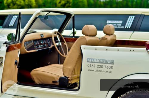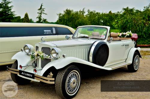 A real head turner wedding car in White metallic , classic wired alloy wheels , 5setas , convertible , open , finishes in cream leather with black linen , a complete joy to travel on your wedding day in this beauford classic wedding car.
